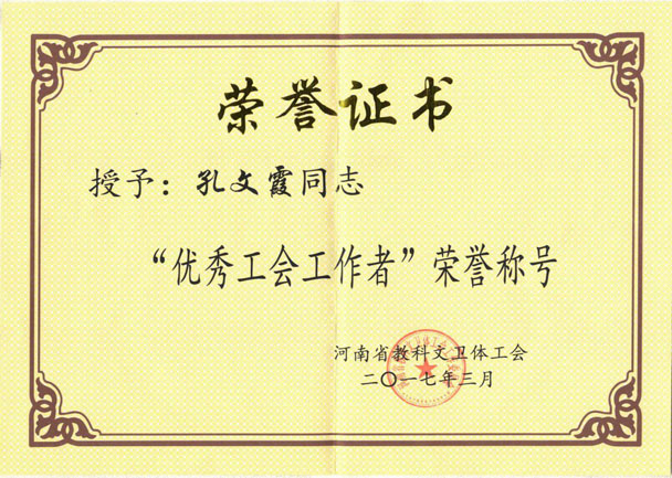 48365365备用网站分工会主席孔文霞老师在2017年3月被河南省教科文卫体工会授予“优秀工会工作者”荣誉称号。