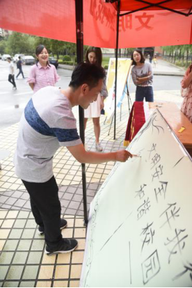 教工和学生在倡议签名板上签名